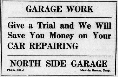 Returning to the old Transcripts, I learned that the owner of the auto repair business, Marvin Swena, added on to the building in 1923 so he could store autos for people who owned cars but didn't have garages.