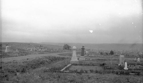 This photo was taken in the Golden Cemetery on May 19, 1935. The newly-completed stone warming house appears in the background. While working on the self-guided cemetery tour yesterday, I looked for the markers shown in that photo.