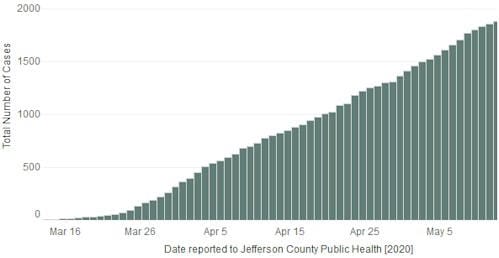 Jefferson County’s case count page says that as of 3PM yesterday, there have been 2,191 cases in Jefferson County (up from 2,120). There have been 135 deaths (up from 128) and 334 are hospitalized (up from 327). There are 176 known cases in Golden (up from 172).