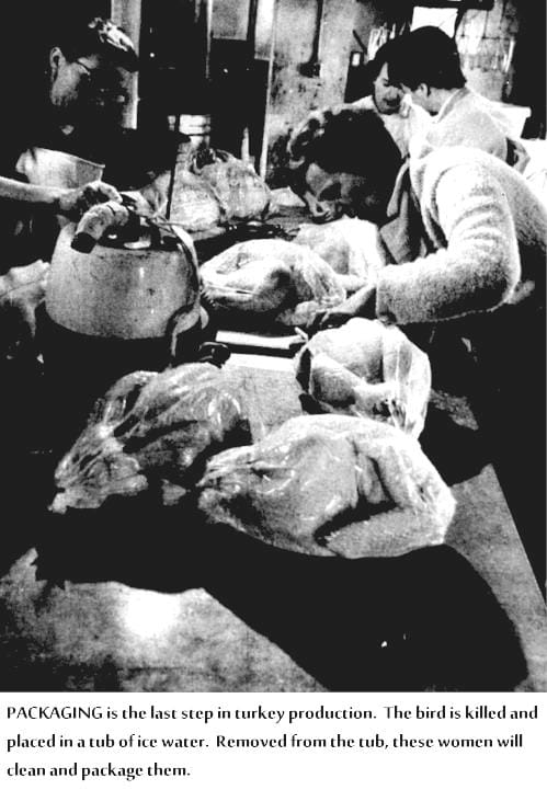 The article described the cycle, beginning with receipt of the day-old “poults” (baby turkeys), which spent 4-1/2 weeks living indoors under heat lamps, followed by several months outdoors. Each bird ate a pound of food a day