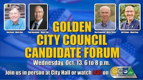 The Leadership Golden Alumni Association (LGAA) is hosting a Candidates Forum in connection with this year’s Golden election of City Councilors. The forum will allow each candidate to respond to questions developed by LGAA membership and the public along with opening and closing statements. For more information, contact Paul Haseman at pvhase@msn.com. The Candidates Forum will also be broadcast live and re-broadcast on Cable Channel 8/880 as well as the city website at www.cityofgolden.net/agendas.