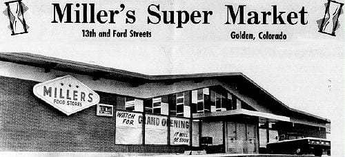 The October 13, 1966 Colorado Transcript announced the opening of Golden’s newest grocery store. Miller’s Super Market operated at 13th and Ford for two years. In 1968, the store was acquired by a regional chain known as Del Farm. In 1975, it became a Mark’n Bag discount grocery store.