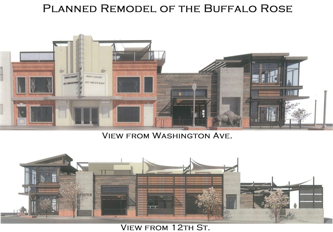 On August 7th, the Historic Preservation Board considered two cases. The first concerned the planned remodeling of the the Buffalo Rose. You may recall the design drawings that made the rounds last summer, which included a two-story glass structure at 12th and Washington and a roof dining area. Many felt that the design was too modern to harmonize with the rest of the historic downtown. The new version looks more like the current version of the Rose–only newer and nicer. The roofline of the building will remain pretty much the way it is now. The board approved the new design, so it will now go on to the Planning Commission.