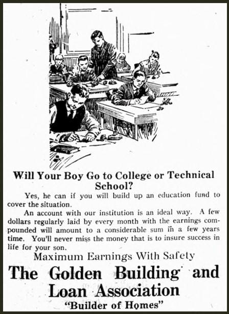 As part of my annual complement of Christmas movies, I recently watched It’s A Wonderful Life. This 1947 classic featured James Stewart, fighting to keep his “Building and Loan” afloat. I wondered what Building and Loans were, and why we never hear about them anymore. I remembered seeing ads for the Golden Building and Loan in old Transcripts. What happened to it?