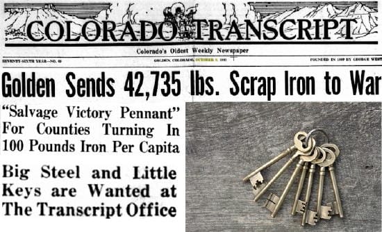 The Transcript put their own spin on the drive. They were collecting stray locks and keys. Apparently many Goldenites had a collection of mystery keys. “Dave Johnston brought in a box full of old locks and keys, no two of which fit; and we have the large key ring, big enough to hang a man, that Fred Robinson turned in full of keys of all sizes, last week.”