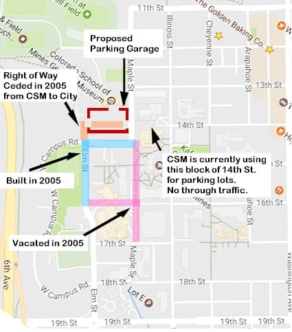 They will also be considering a request by the Colorado School of Mines to vacate a city right of way, in order to allow them to construct a parking garage. Over the past several years, the City has allowed the School to close several streets through the campus, including parts of 16th, 18th, and Maple Streets. When the city allowed the School to close 16th Street, they did so in exchange for a right of way to extend 14th Street to the west. This piece of 14th Street hasn’t been built to date, and the school now wants the right of way back, in order to build the parking garage.