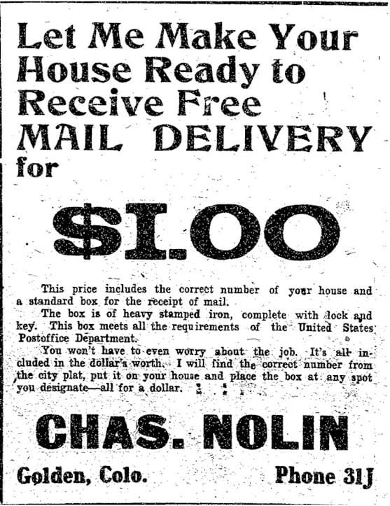 The October 26, 1916 Colorado Transcript included an advertisement by Charles Nolin, offering to provide a mailbox, install it on your house, and and including your street address. Why would this service warrant a display ad in the paper? Was Nolin expecting a sudden surge in demand for mailboxes?