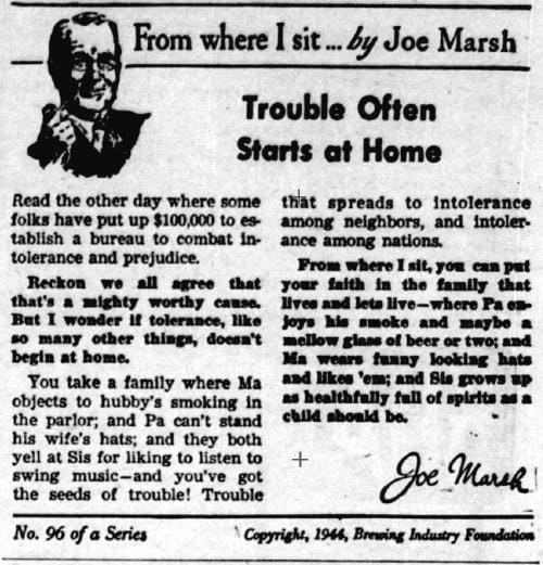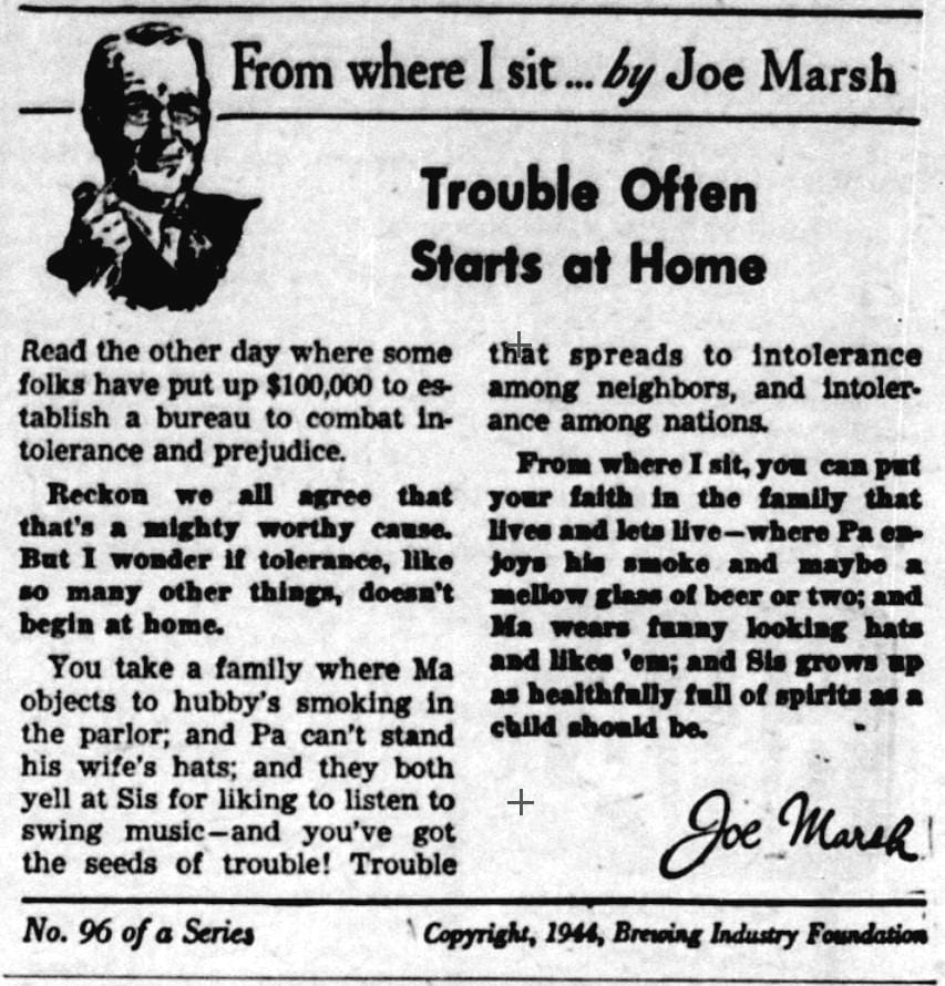 That same issue of the paper included another apparent “column” entitled “From Where I Sit…by Joe Marsh.” That one propounded the importance of tolerance so that everyone gets along with everyone else. One of things people should tolerate is “Pa” enjoying “a mellow glass of beer or two.” That one said “Copyright, 1944, Brewing Industry Foundation.”
