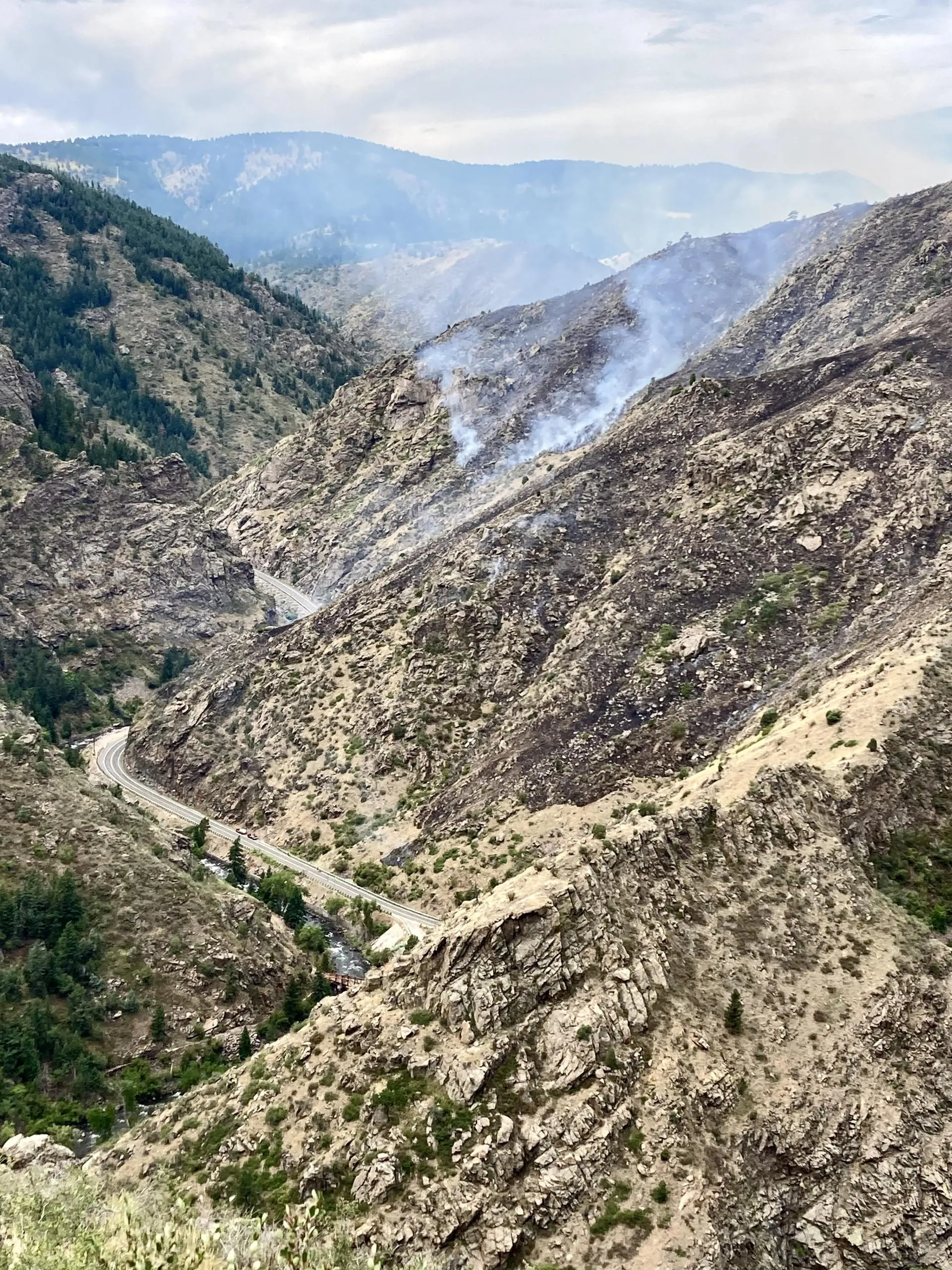 As of last night, the County reported that the fire in Clear Creek Canyon (which they're calling the "Goltra Fire") was 60% contained. They also stated that the area in which the firefighters are working is treacherous--very steep, slippery rock footing, and lots of rattlesnakes.