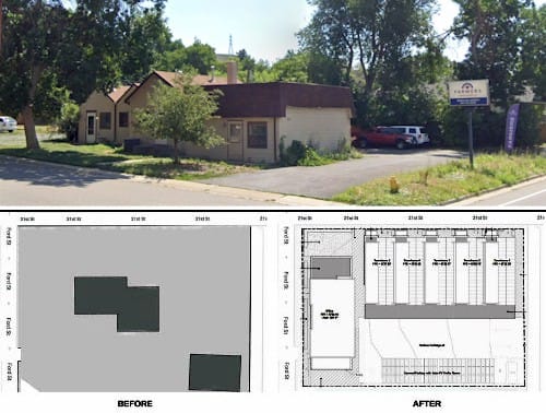 The third case concerns the corner of 14th and Jackson. This developer proposes turning the existing house into a 3-room tourist home (short-term rental) and building 8 new one bedroom apartments south of the house. In this case, the tourist home supplies the commercial component and the 8 apartments provide the residential aspect, so no Special Use Permit would be required.