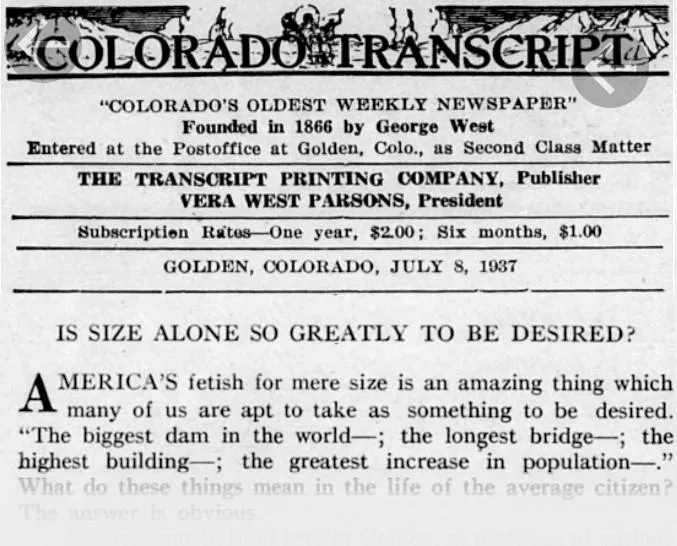 The July 8, 1937 Colorado Transcript included an editorial that was so familiar, it could have been written last week. In "IS SIZE ALONE SO GREATLY TO BE DESIRED?" The editors were questioning the necessity of growth and change. This conversation has been going on for more than 150 years. What made this iteration unusual was that the Transcript was asking the question. Usually, the Transcript was all in favor of growth and regarded growth resisters as crackpots.