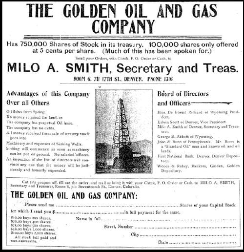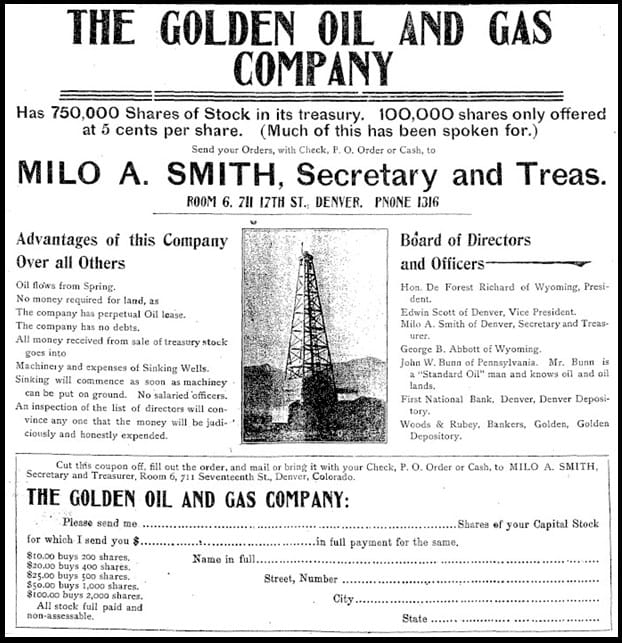 In 1902, the front range (and Golden along with it) was in the throes of oil fever. Oil had been discovered the previous year in the Boulder area, and people were optimistic that more would be forthcoming. Oil speculators frantically sought investors to help fund oil exploration, and Golden residents were excited at the prospect of oil-borne prosperity.