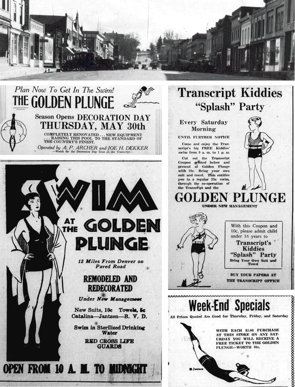 The March 3, 1927 Colorado Transcript reported that the Golden Plunge had celebrated their grand opening the previous Sunday. This indoor swimming pool was located at 1117 Washington Avenue (map). It was 100 feet long and 30 feet wide and ranged from 3 to 9 feet deep.