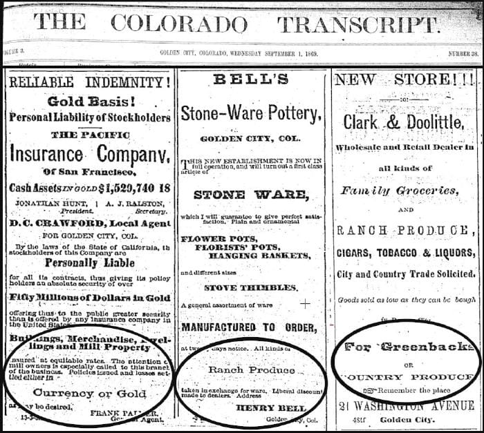 The September 1, 1869 Colorado Transcript includes several examples of “trade.” The Pacific Insurance Company accepted “Currency or Gold.” Bell’s Stone-Ware Pottery exchanged pottery for “Ranch Produce.” Clark & Doolittle took either “Greenbacks or Country Produce.”