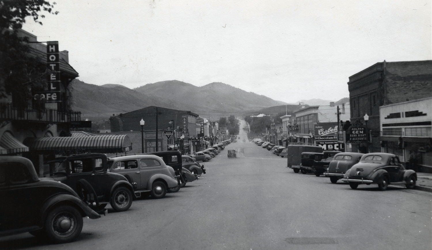 The new, 1936 lights were described as “Golden’s Great White Way.” The paper enthused that the new lighting “will greatly facilitate evening window shopping, which will be a real pleasure with the marvelous new stocks of merchandise now on display by Golden merchants. Heretofore, persons who wanted to see goods being shown in many show windows at night would have had to carry a flash light or a candle.”