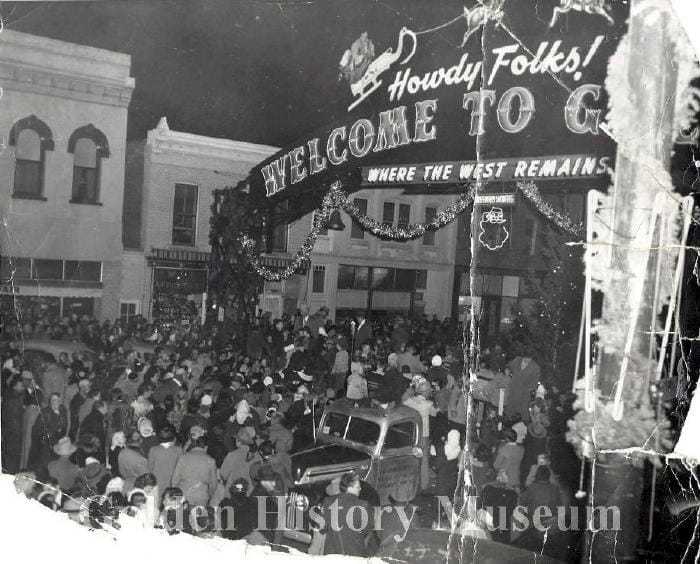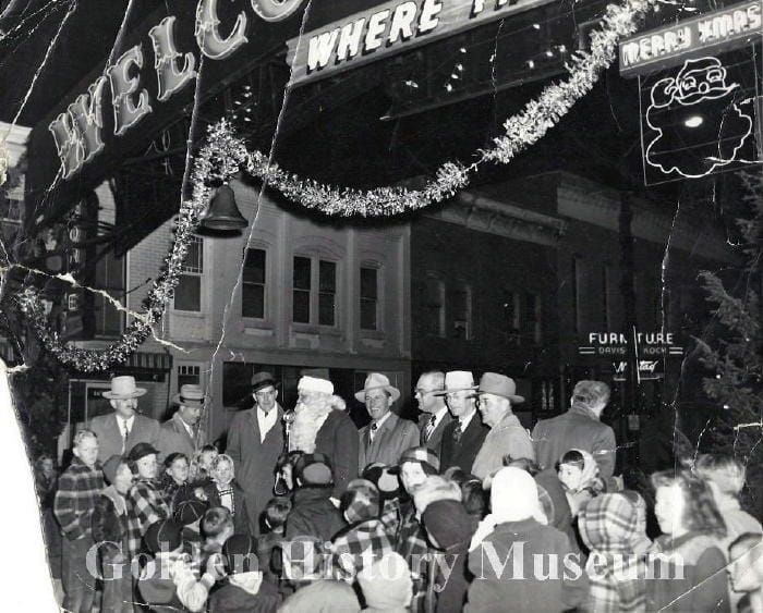 The Welcome Arch was built in 1949. Originally, “Welcome to Golden” was outlined in neon. People were excited about the new landmark, and the 1100 block of Washington Avenue immediately became the visual center of the City. The Chamber had spearheaded the arch, and as Christmas approached, they wanted to make the arch the focal point of the seasonal celebrations. They decided that Santa and his reindeer were just what we needed.