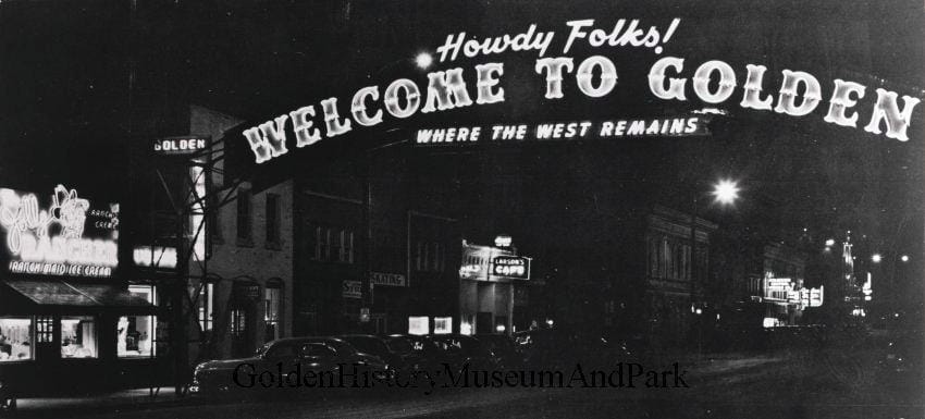 On March 24, 1949, Golden was celebrating an enlightening night. The Welcome Arch had just been completed, with its original neon lettering, and the public gathered to watch it be illuminated for the first time. In addition, the Golden Theater had undergone a refurbishment, and its new neon marquee was coming online.