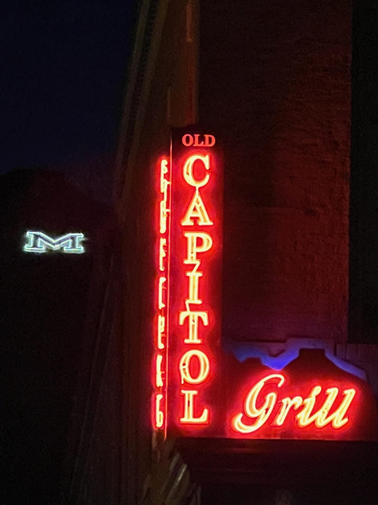 Neon signs were popular throughout the ’50s and ’60s. One reason they started to wane in popularity was the expense and difficulty of keeping them in operation. Most neon signs are custom built, so businesses can see their names in distinctive fonts. That means that when they break, skilled craftsmen are required to repair them. Eventually the City redid the arch with reflective–rather than neon–lettering.