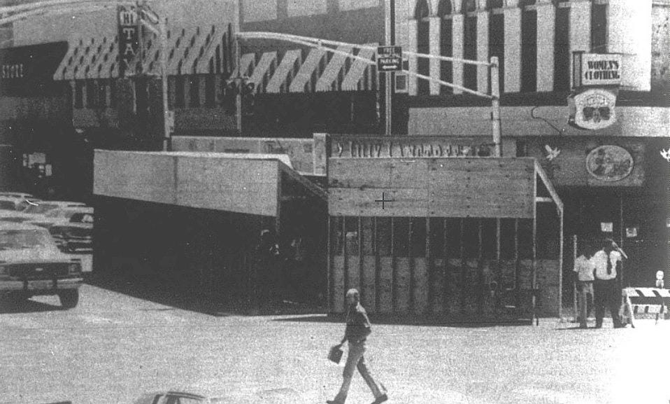 There was an ongoing battle with the City, with the building inspector insisting that the owner construct a covered walkway to protect the public from the danger of falling bricks, while City Council wanted the barrier removed because it was unsightly and took up parking spaces.