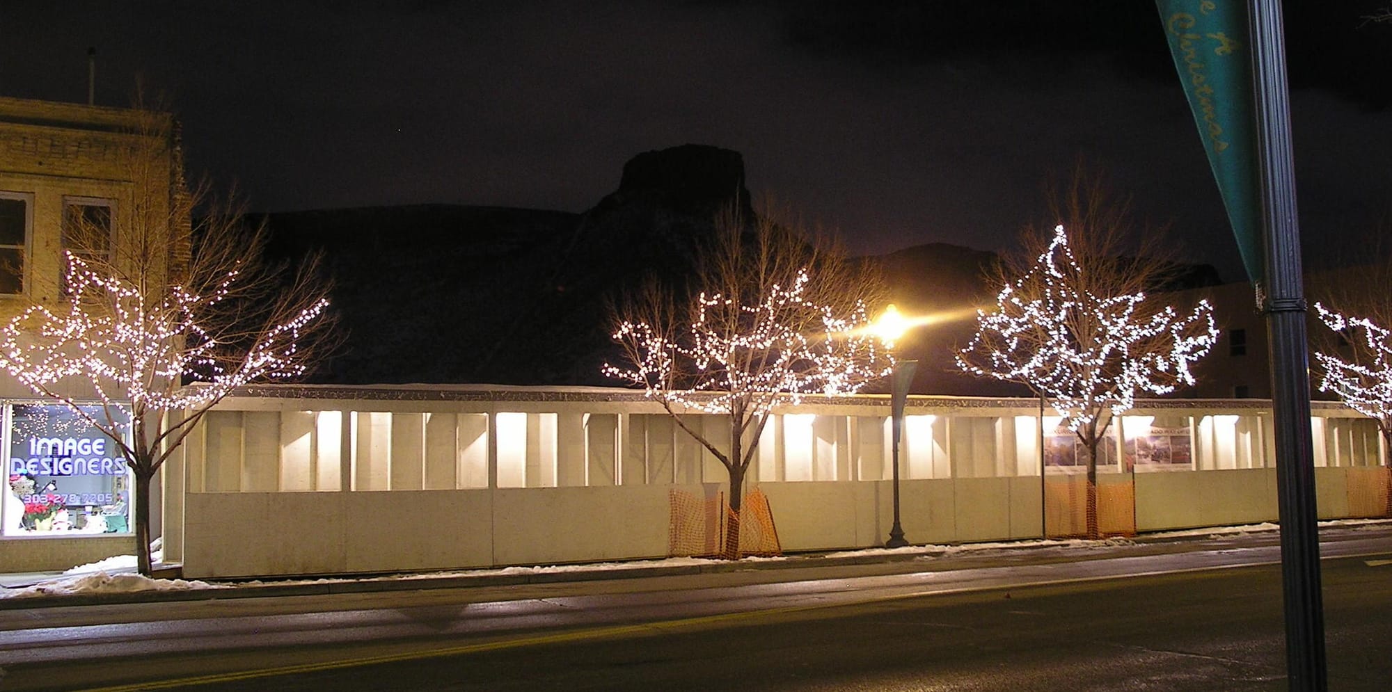 The Hested’s building had been demolished, and there was a big hole in the ground, where the Gateway Station foundation would go. The white structure is the temporary covered sidewalk they had up during construction I took the picture because I liked the temporary view of Castle Rock.