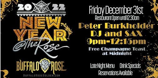 Celebrate the New Year at Buffalo Rose restaurant. The restaurant is open until 12:30AM with live music 9PM – 12:15AM with Peter Burkholder DJ & Sax. No cover. Free champagne toast at midnight. Prime rib special available for $29. Regular menu available until 10:45pm and late menu available 11:00-11:45pm. Drink specials are available all night. Reservations can be made at the restaurant. It’s going to be a fun night of live music, great food, and delicious drinks so make plans now to spend New Year’s Eve at Buffalo Rose restaurant.
