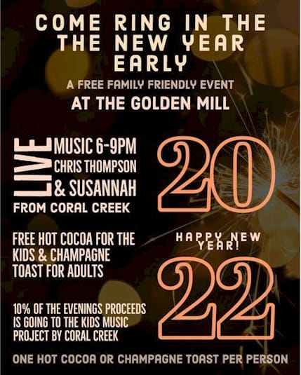 Ring in the New Year here at the Golden Mill. Music from Chris Thompson & Susanna from 6-9pm. Free hot cocoa toast for the kids & champagne toast for 21+ Learn more….
