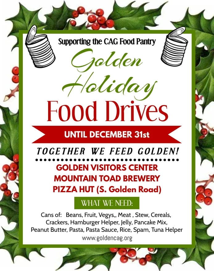 This is the final day of a Christian Action Guild food drive at Mountain Toad Brewing (map), the Golden Visitors Center (map), and Golden Pizza Hut (map), so if you’d like to donate some food to the food pantry, stop by one of those locations today! Of course, cash contributions are always welcome.