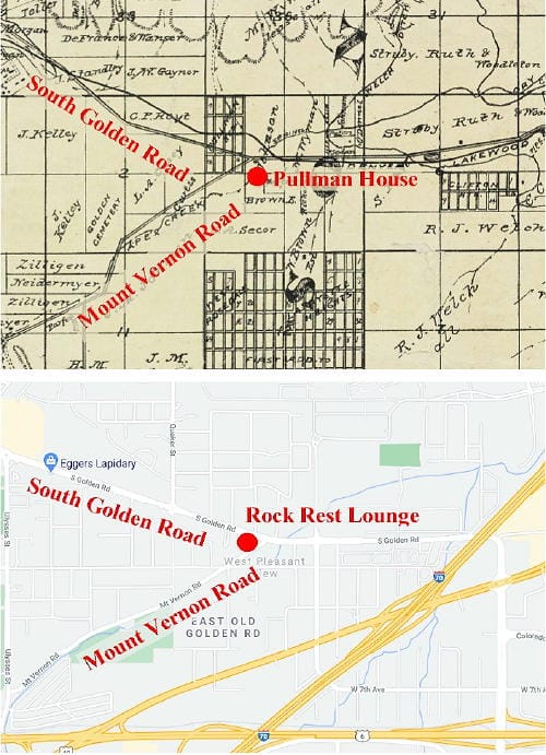 But there’s more to Mt. Vernon Road. Cold Spring Ranch was an early Colorado ranch formed in 1860 on 320 acres near the crossroads of the Denver-Golden Road and Mt. Vernon Road. The now Rock Rest Restaurant is on one corner and Walt’s Tire Service on the other. By 1861 George Pullman, Spafford Fields (“Mr. Fields”) and other associates had acquired and expanded the ranch to 1600 acres bounded on the east by what is now Indiana Street, on the west by Ulysses Street, and on the north by South Table Mountain. A part of the former ranch is now the southern portion of Camp George West. Pullman built the “Pullman House” at this intersection as it was a “halfway” station for gold hunters headed for the mountains via Mt. Vernon Road.