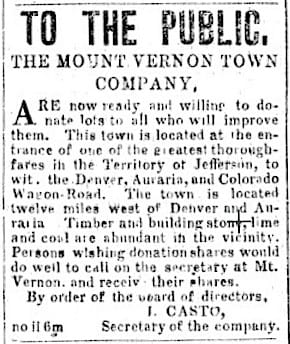 Before there was I-70 and U.S. 40, the 1859 Mt. Vernon toll road ran up the same canyon to the gold fields. The route to the toll road came through Golden on the 1859 St. Vrain (Longmont) Golden City & Colorado Wagon Road to Mt. Vernon and beyond. One purpose of the road was to route gold seekers through Golden and bypass Denver.