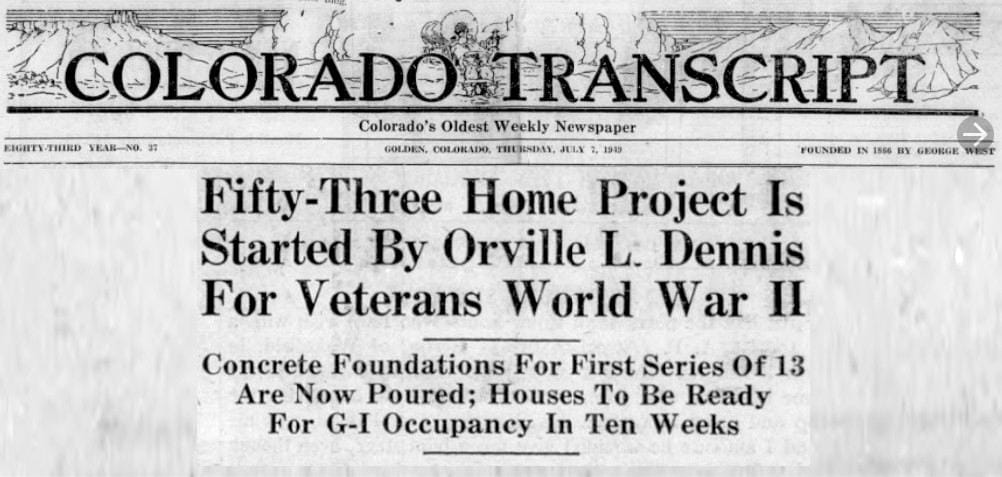 Orville Dennis also built many homes in Golden for the veteran market. He began in 1949, with the first batch being on 2nd Street between Washington and Ford. The homes were 24×24 feet, with two bedrooms and one bath. They sold for $6700. In 1950, Dennis built an additional twelve houses on North Ford near the Foss Ranch. Those homes sold for $8500. He then moved on to Goldco Circle (the former Cemetery Hill), with those houses ranging from $7000 to $8500.