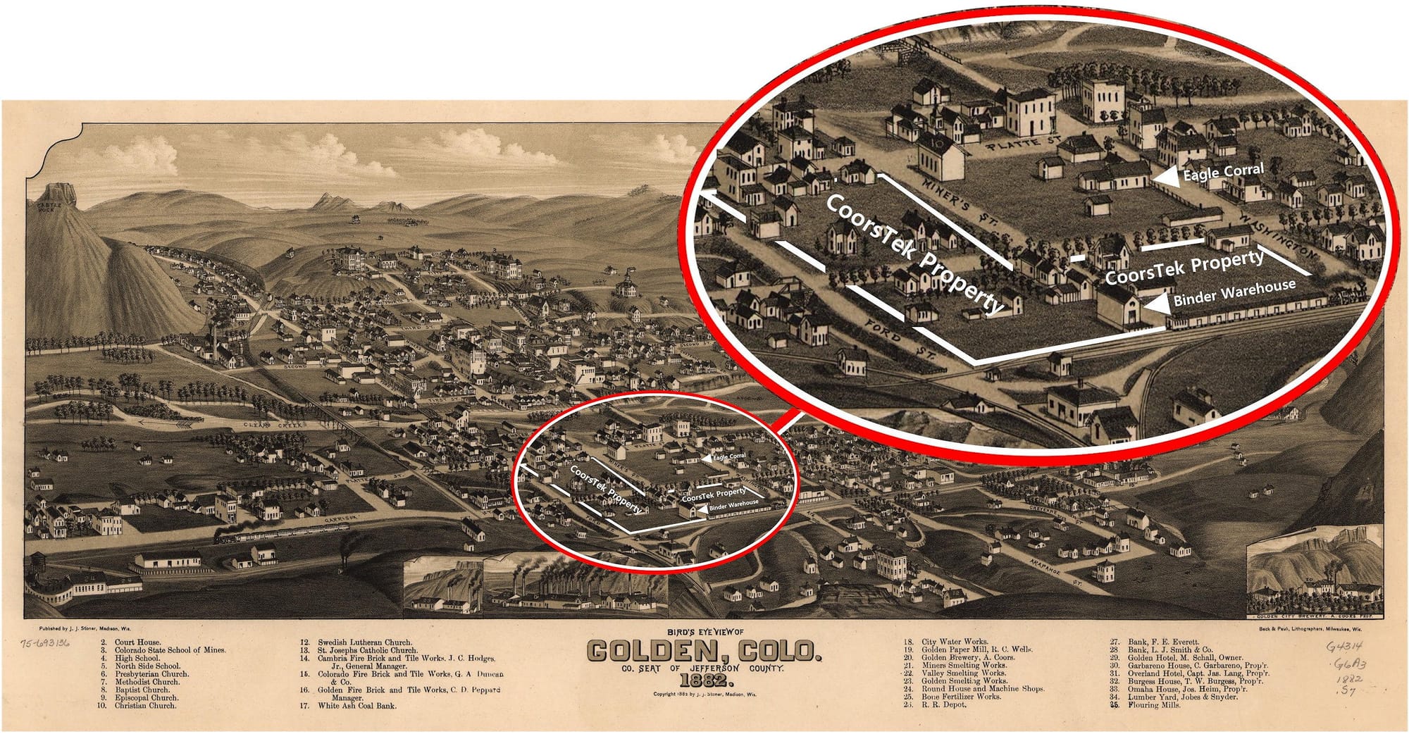 1882 Birdseye View Map of Golden Colorado with the CoorsTek property highlighted and Binder Grain Warehouse & Eagle Corral labeled