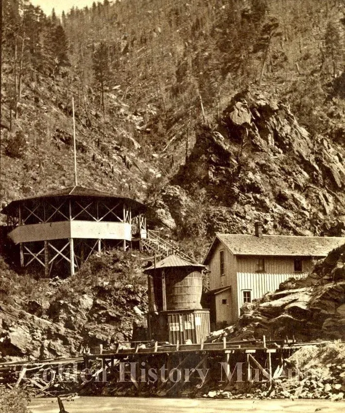 Beaver Brook Station in Clear Creek Canyon, a stop on the Colorado Central Railroad: the structure above the station was used for picnics and dances. – Golden History Museum collection