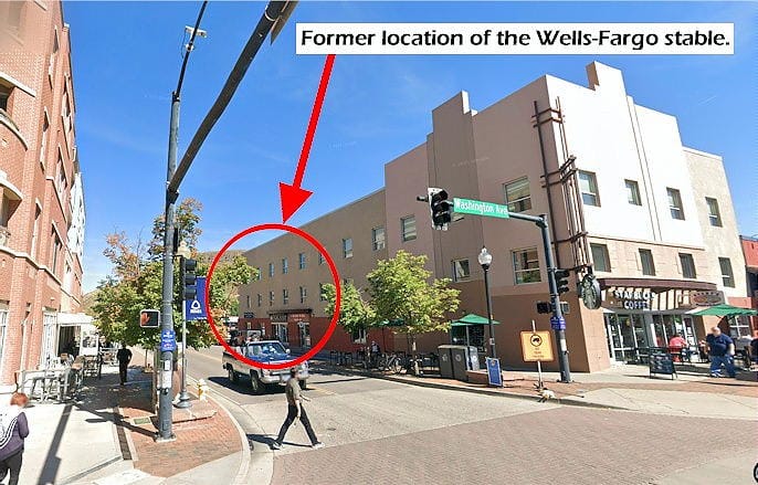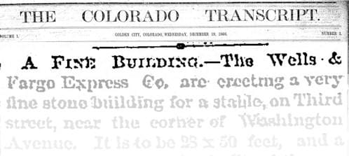 The very first issue of the Colorado Transcript appeared on December 19, 1866. One of the articles mentioned that the Wells-Fargo stagecoach company was building a stone stable on 13th Street (which was called 3rd Street at the time), east of Washington Avenue.