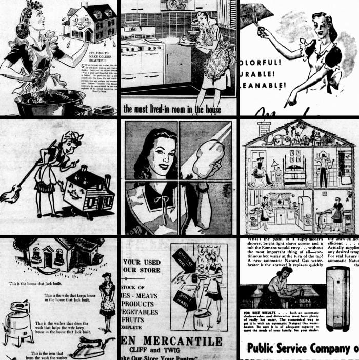 Women rarely appeared in advertisements before World War II, but after the War they were pervasive, wearing dresses and frilly aprons and enjoying new, labor-saving appliances.