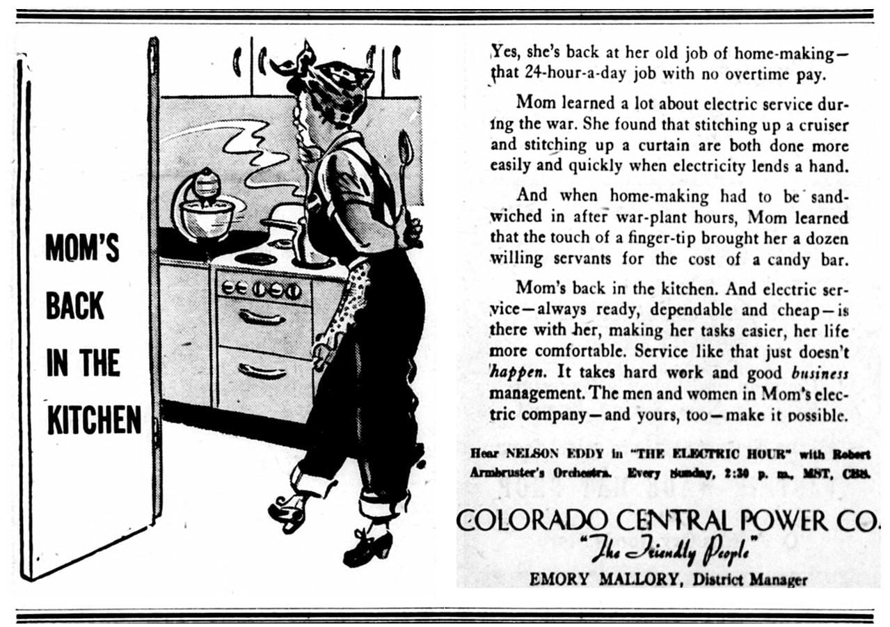 Colorado Central Power Company Ad saying “Mom’s Back in the Kitchen” – Colorado Transcript – March 14, 1946