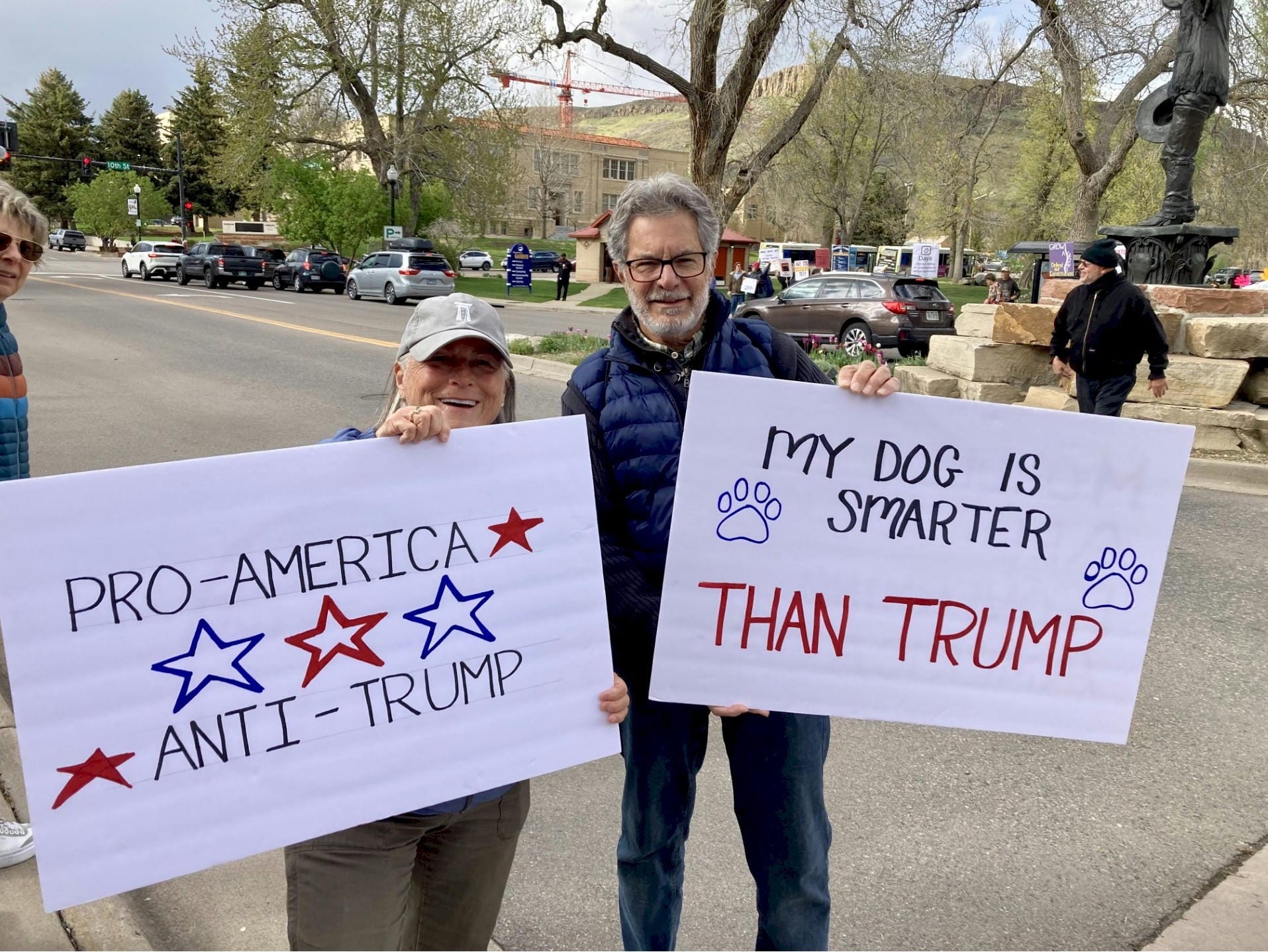 Protestors gathered on either side of the street near the Buffalo Bill statue.