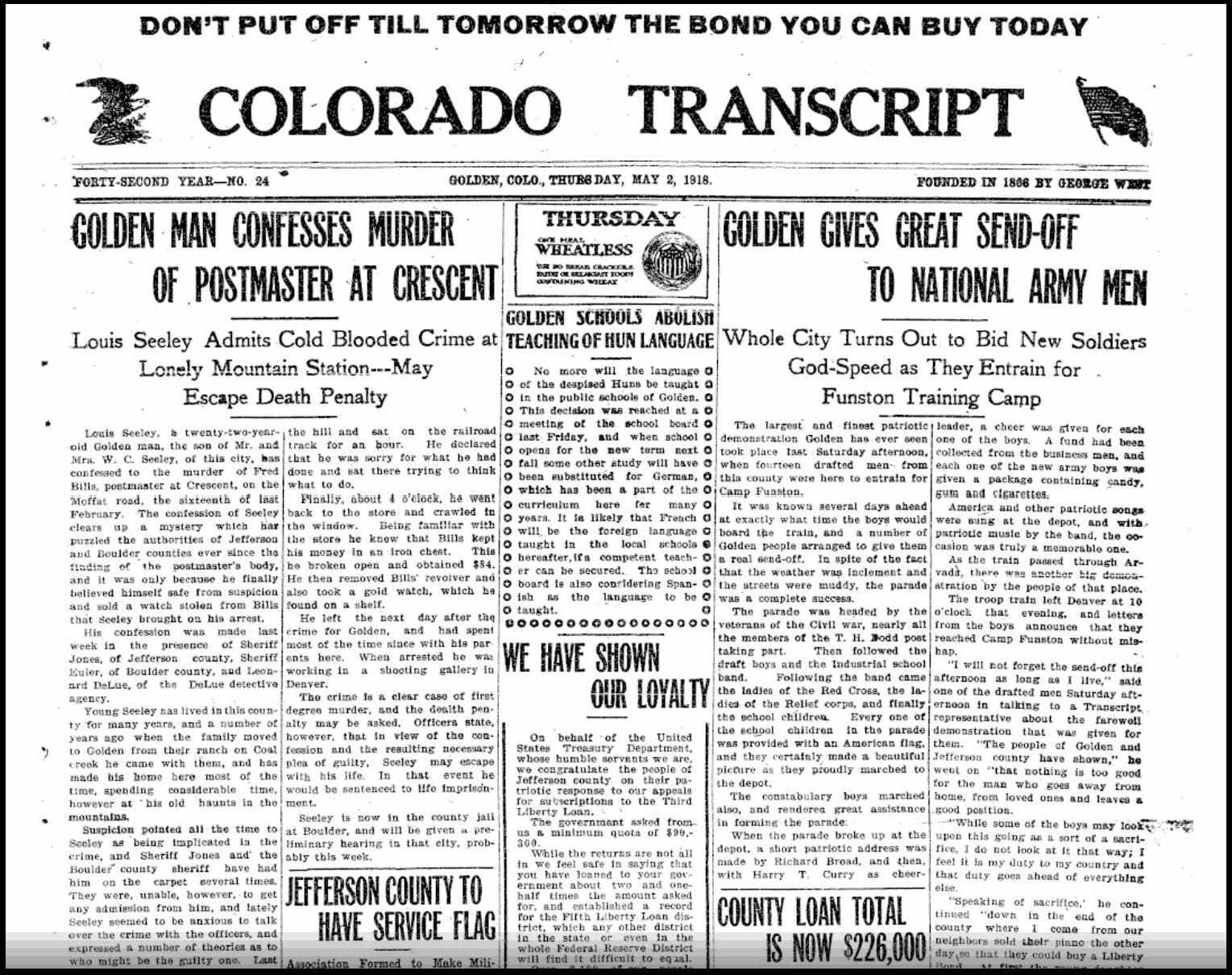 The May 2, 1918 Colorado Transcript shows Golden at the high tide of World War I-inspired patriotism. The front page featured a lengthy article describing the parade the community had given in honor of fourteen men who had been drafted, calling it "the largest and finest patriotic demonstration Golden has ever seen." Participants included Civil War veterans, the Industrial School band, the ladies of the Red Cross, the ladies of the relief corps, the "constabulary boys" (Golden police), and school children carrying American flags. As the future service men boarded the train, they were each given a package containing candy, gum, and cigarettes.