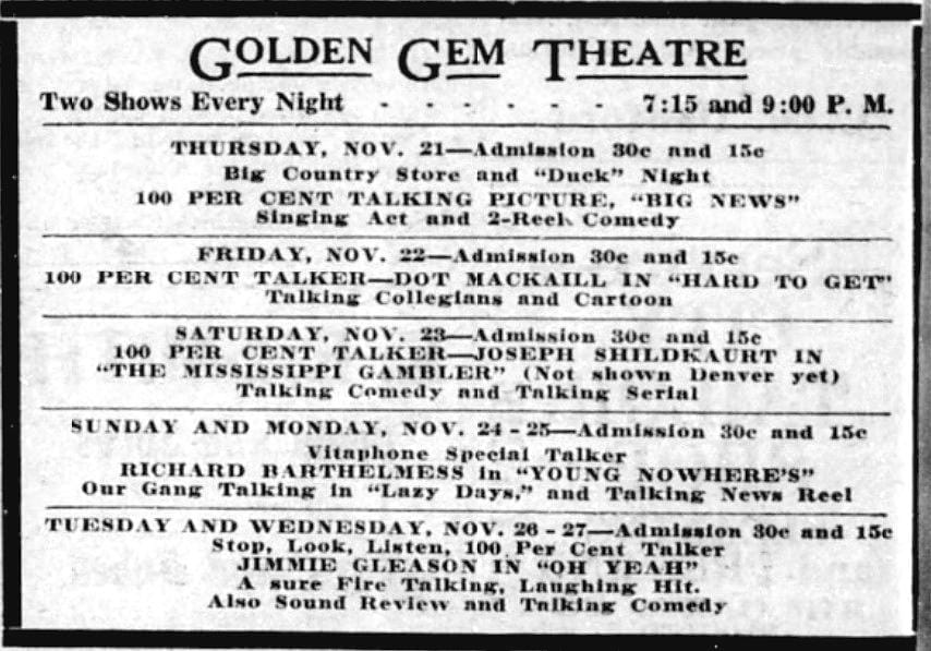 Another technological marvel had come to town: the Golden Gem Theater was showing talkies! You can watch the 100 PER CENT TALKING PICTURE that they showed 96 years ago today: Big News.