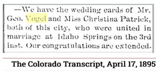 Vogel eventually sold his feed store in Golden and became a Coors distributor in Central City. He and Christina had several more children, all duly announced in the Transcript. He made periodic business trips to Golden, where, according to the Transcript, his friends were always glad to see him.
