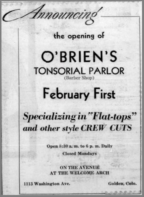 The January 31, 1957 Colorado Transcript announced the opening of O'Brien's Tonsorial Parlor, a new barber shop at 1113 Washington Avenue, owned by Jack O'Brien. In keeping with the times, the shop's first newspaper ad announced that they specialized in "Flat-tops and other style CREW CUTS."