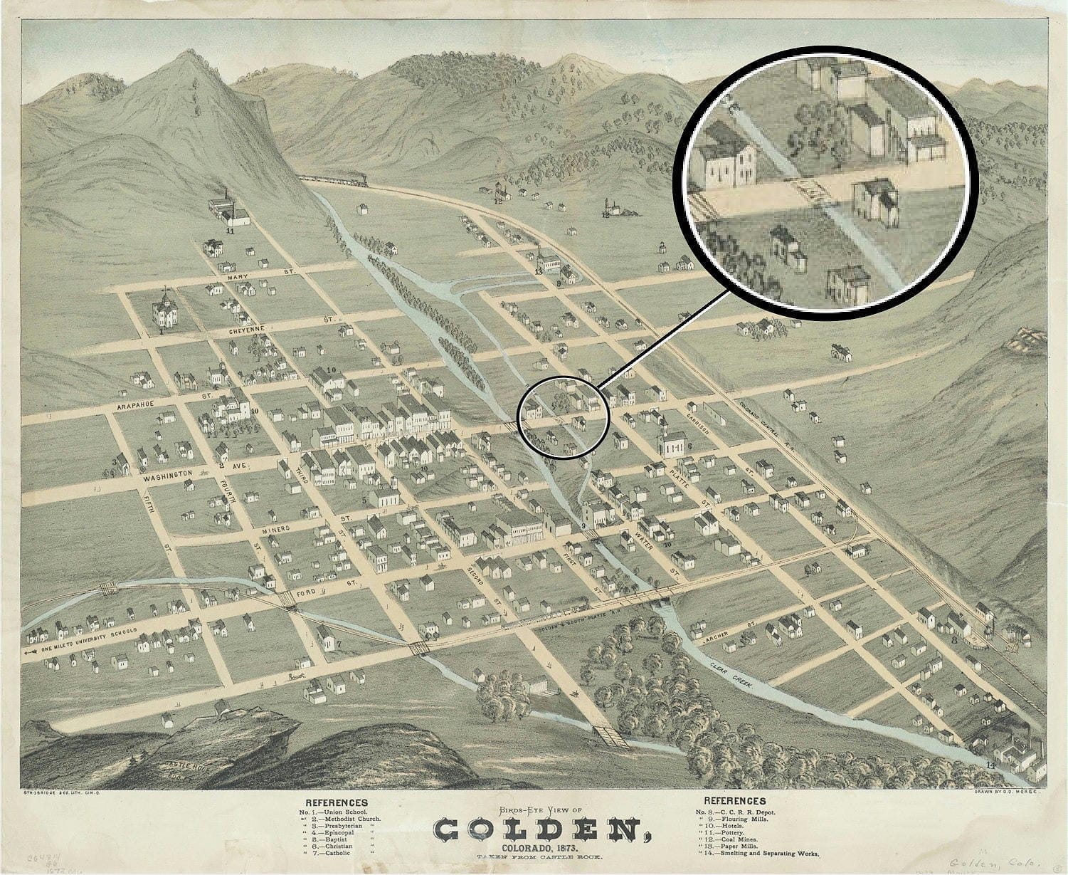 Wooden bridge over the millrace, highlighted on the 1873 Birdseye View map of Golden