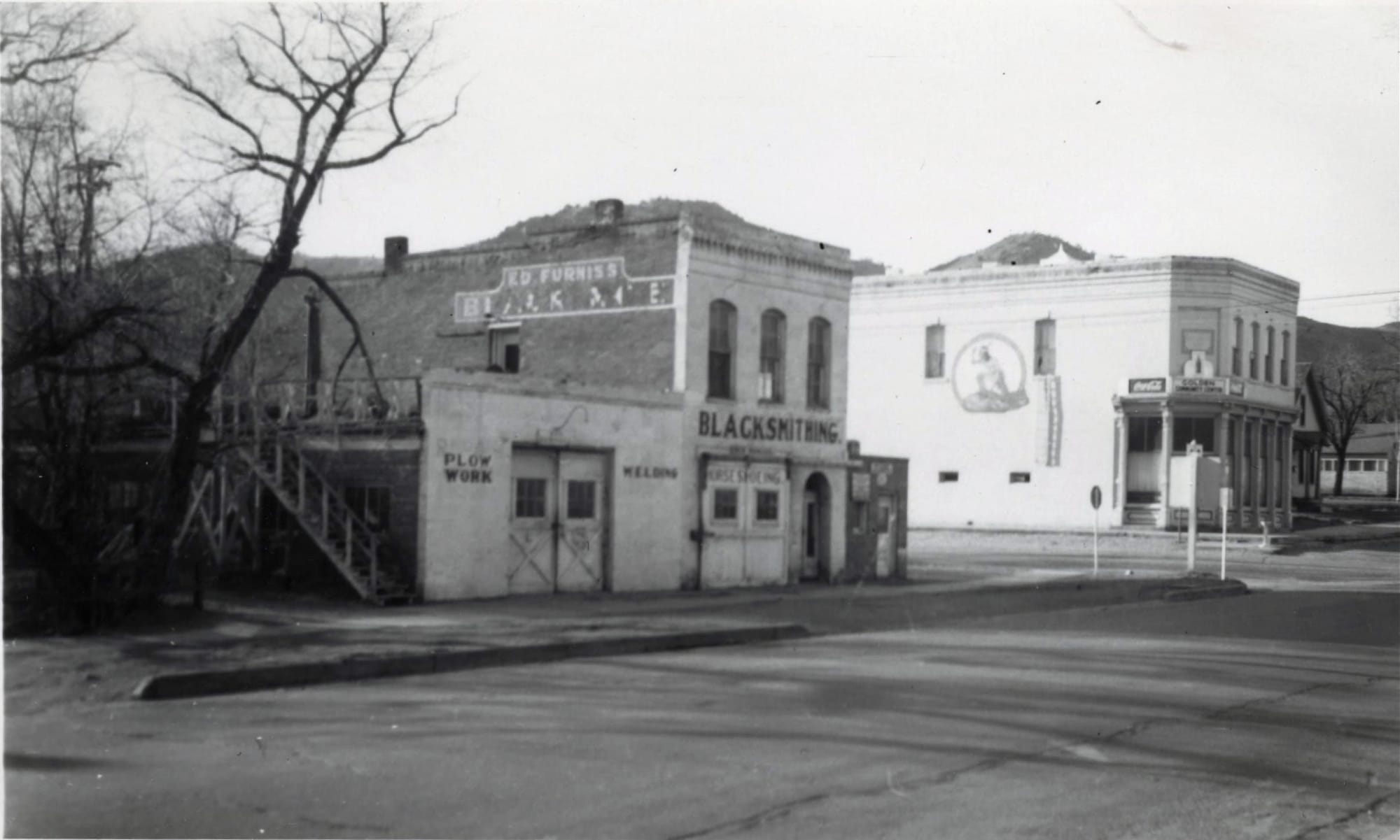 The service station had replaced Ed Furniss’s blacksmithing shop. Ed moved into that building in 1914. Beginning in 1922, he also operated a filling station on the site. Mr. Furniss retired in 1945, died in 1951 at the age of 80, and is buried in the Golden Cemetery.