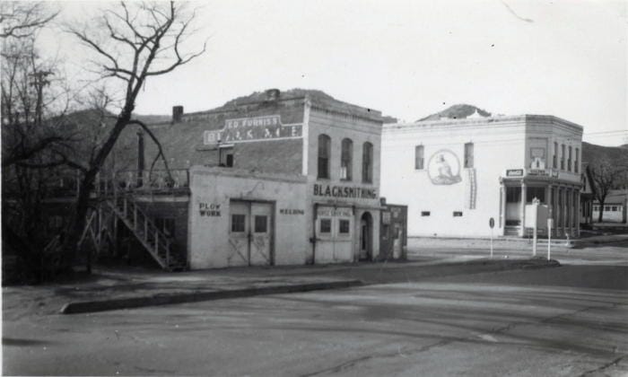 That corner had seen many businesses over the years. The historic Sanborn Insurance Maps show that the site had been occupied by a Flour & Feed Store (1886), “Oil Etc.” (1890), a Meat Market (1895), Grocery Store (1906 and 1911), the blacksmith shop (on the 1919 map), and finally the Frontier service station.