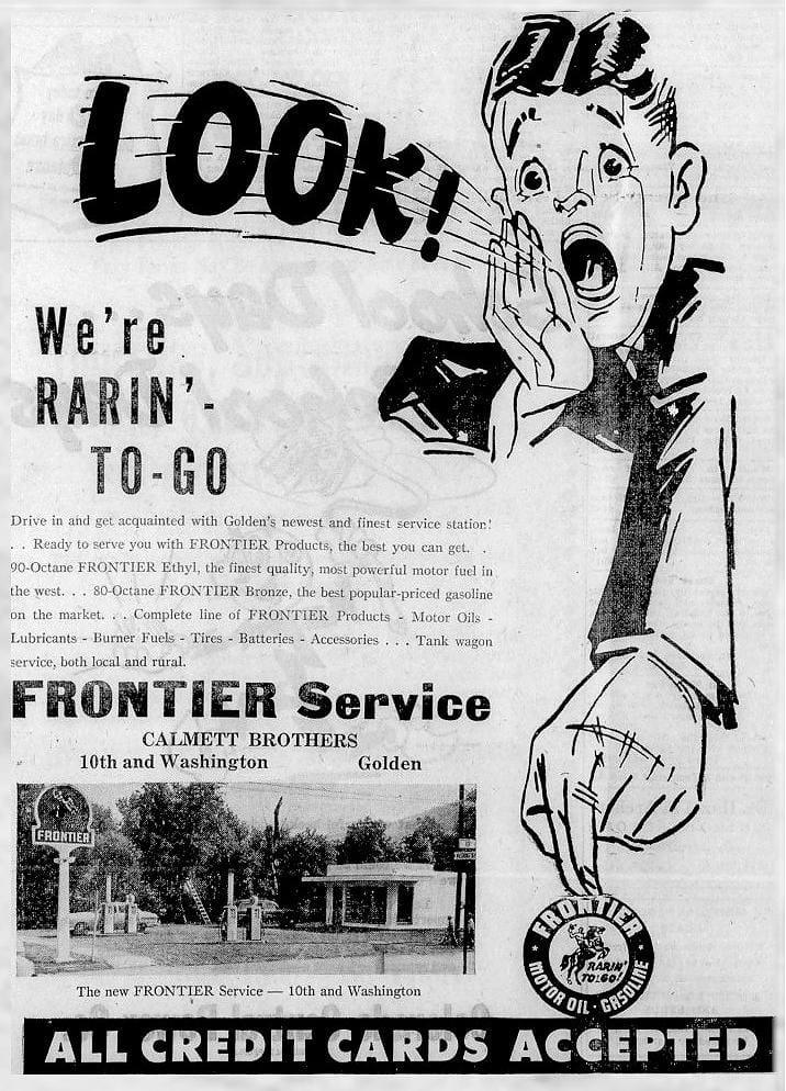 The September 6, 1951 Colorado Transcript announced the grand opening of a new Frontier service station at 10th and Washington. They planned a party for Saturday, September 8th, with “Cowboy entertainment” and balloons for the kids.