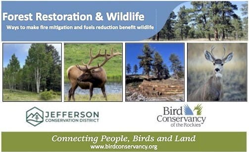 Please join Bird Conservancy of the Rockies' Wildlife Habitat Biologist Kyle Deschenes for a presentation on reducing the effects of wildfire and increasing wildlife habitat. Kyle will be joined by foresters from the Jefferson Conservation District (JCD) who will provide information about their forestry program.