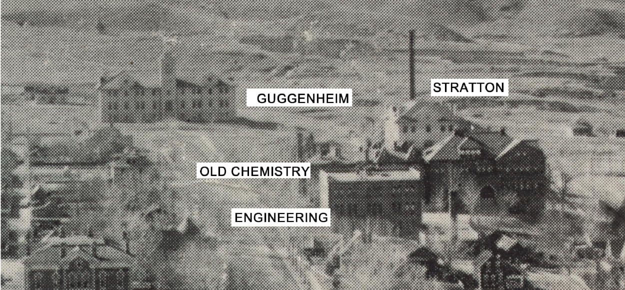 The building that replaced it opened in 1958. It was called “the Metallurgy Building” for several years, until it was officially named “Nathaniel P. Hill Hall” in 1964. Hill (1832-1900) was a founder of the smelting industry in Colorado. He served on the original Board of Trustees for the School of Mines, spent six years in Washington D.C. as a Senator from Colorado, and in later years taught classes at the School of Mines. (Sources: Colorado Transcript and National Mining Hall of Fame website)