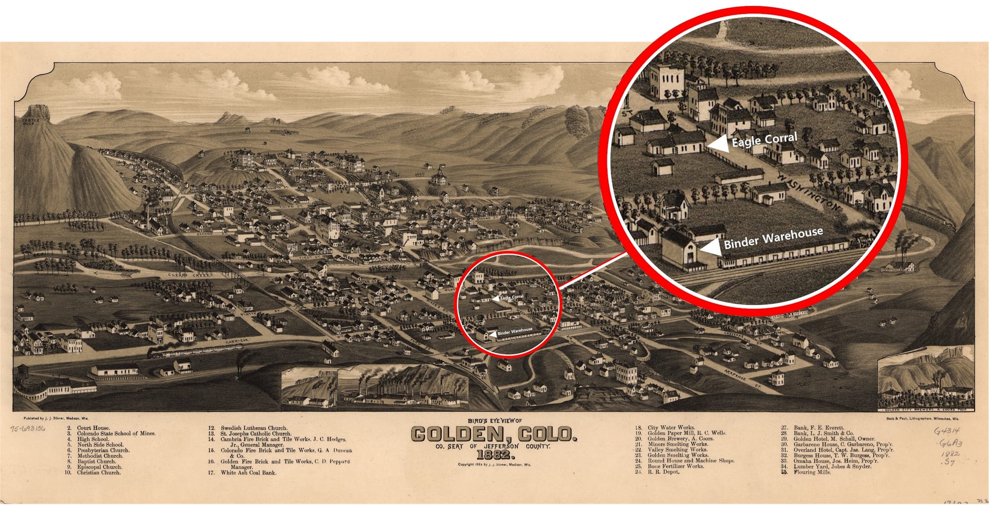 I often use excerpts from the 1882 Birdseye Map of Golden (the brown one, below) to show buildings from our early days. The one above is even earlier–1873!