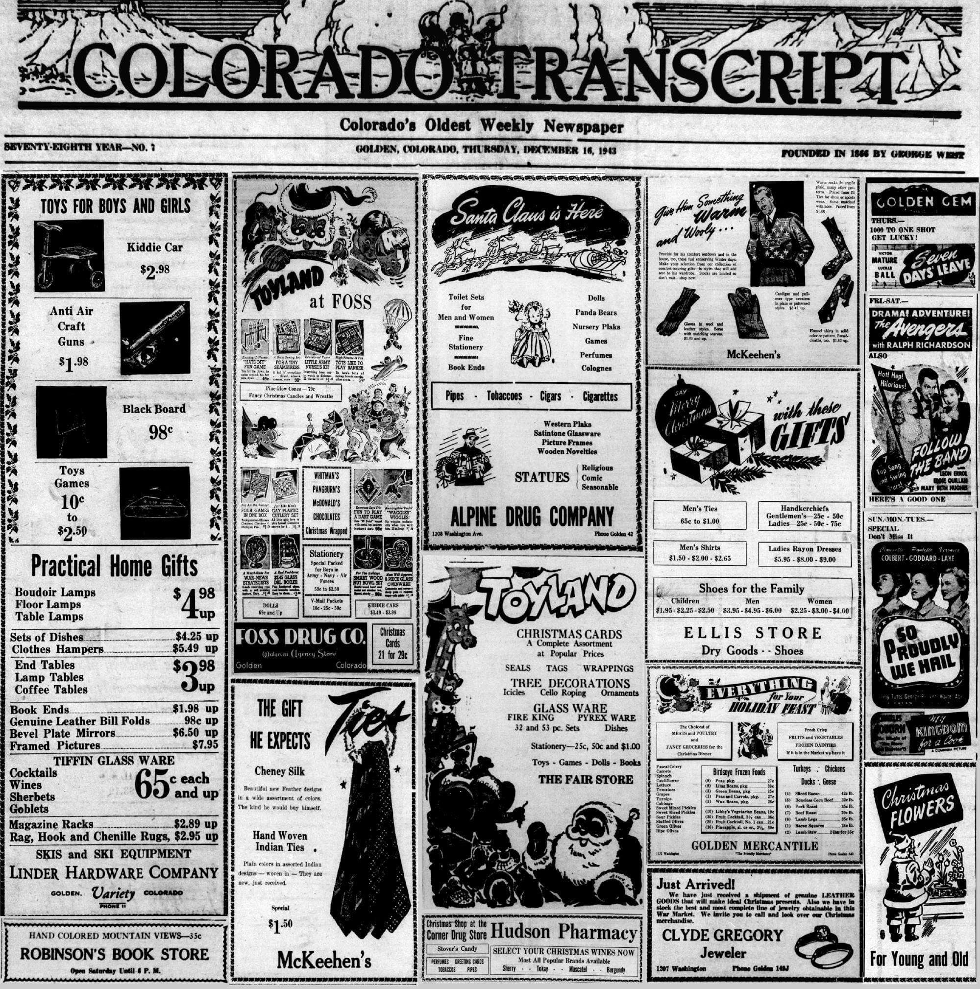 The December 16, 1943 Colorado Transcript urged people to hurry out to the stores before they ran out of merchandise. They announced this with an unsettling headline: