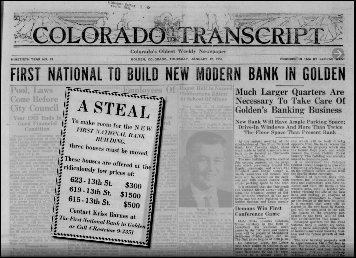 The January 12, 1956 Colorado Transcript announced that 1st National Bank would be moving from their historic home at 12th and Washington (currently Golden Goods). They were planning to build a new, modern structure with more space, more parking, and a drive-through window.
