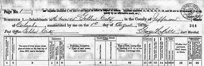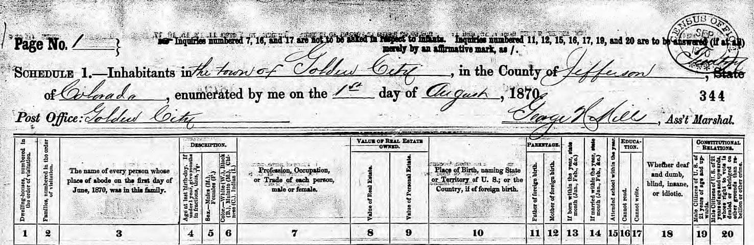 Recently, I went on a hunt for the 1870 census records for Golden. To my surprise, I wasn’t able to get the breakdown from the US Census; instead, they directed me to ancestry.com. I set up a two week trial membership.